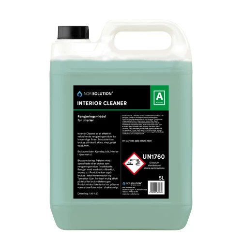 Nor Solution Interior Cleaner er en velduftende alkalisk interiørrens for rengjøring av innvendige flater på kjøretøy. Produktet kan brukes på tekstil, skinn vinyl, plast og gummi. For optimal effekt på tekstiler bruk våtstøvsuger.