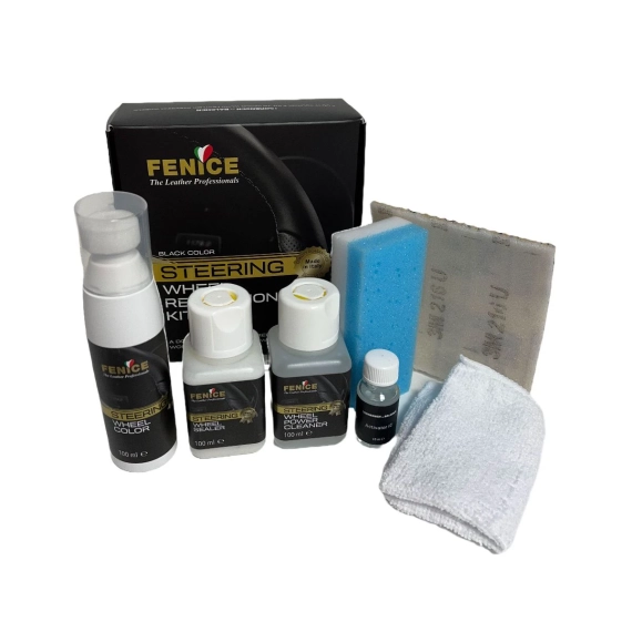 - Fukt den medfølgende svampen i lunket vann og ha på Fenice Steering Wheel Power Cleaner på den hvite siden av svampen.